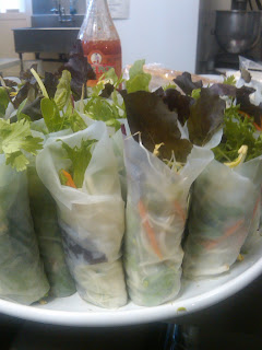 Who doesn't love a good Thai spring roll? Here is the ingredient list for our spring rolls. Rice paper wrapper, somen noodles, rice wine vinegar, mixed greens, finely shredded carrots, mung beans, clover sprouts, cilantro, basil, and mint. Packed with flavor they are super tasty. Although pretty much everyone in our kitchen hates making them, they are time consuming beyond belief with that many ingredients. We serve them with sweet chili dipping sauce and/or our homemade peanut sauce (you know that gloppy kind that reminds you of wallpaper paste but coats your mouth with peanut butter and hoisin flavor... not that kind.) Our peanut sauce is a puree of sauteed red torpedo peppers and garlic and cilantro stems, peanut butter, lime, salt, and coconut milk. Its fantastic.
